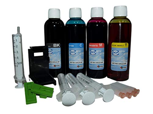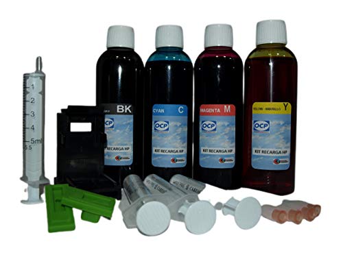 Kit de recarga para cartuchos de tinta hp 350 – 351xl negro y color, incluye clip y accesorios + 400 ml tinta válido para cartuchos hp modelos nº: 350 y 351 negro y tricolor nuevo: con trasportin y gomas que permiten la extracción de aire del cartucho; tintas específicas y formuladas por ocp especialmente para estos cartuchos; no son tintas genéricas ni universales; solo la mejor calidad entre otros muchos modelos para las impresoras: hp photosmart d5368 hp officejet j5742 hp officejet j5783 hp officejet j6488 hp deskjet d4368 hp photosmart c4283 hp photosmart c4488 hp photosmart c4583 hp photosmart c4588 hp photosmart c5283 hp deskjet d4260 hp deskjet d4360 hp officejet j5725 hp officejet j5730 hp officejet j5735 hp officejet j5740 hp officejet j5750 hp officejet j5780 hp officejet j5785 hp officejet j6405 hp officejet j6410 hp officejet j6415 hp officejet j6424 hp officejet j6450 hp officejet j6480 hp photosmart c4225 hp photosmart c4270 hp photosmart c4280 hp photosmart c4324 hp photosmart c4340 hp photosmart c4345 hp photosmart c4380 hp photosmart c4384 hp photosmart c4385 hp photosmart c4410 hp photosmart c4424 hp photosmart c4435 hp photosmart c4440 hp photosmart c4450 hp photosmart c4470 hp photosmart c4475 hp photosmart c4480 hp photosmart c4485 hp photosmart c4486 hp photosmart c4524 hp photosmart c4540 hp photosmart c4550 hp photosmart c4570 hp photosmart c4572 hp photosmart c4575 hp photosmart c4580 hp photosmart c4585 hp photosmart c5240 hp photosmart c5250 hp photosmart c5270 hp photosmart c5275 hp photosmart c5280 hp photosmart c5290 hp photosmart c5580 hp photosmart d5345 hp photosmart d5355 hp photosmart d5360 hp photosmart kit compuesto por: 1 botella con 100ml de tinta negra pigmentada 1 botella con 100ml de tinta cyan 1 botella con 100ml de tinta magenta 1 botella con 100ml de tinta amarillo 4 jeringuillas con aguja 1 juego de guantes 1 trasportin negro con 2 gomas para extracción de aire del cartucho y purgado. 1 para el negro + 1 para el color.
