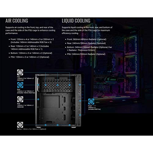 Hasta 12 ventiladores: 4/3/2 frontales de 120/140/200 mm, 2 traseros de 120 o 140 mm, 3/2 inferiores de 120/ y 3/2 de psu de 120/ (4 ventiladores rgb de 140 mm incluidos)