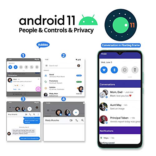 【Android 11, Más Fluido y Más Funciones】Blackview A70 Equipa con el sistema más novedoso Android 11, se dedica en comunicaciónes entre la gente, collecta las mensajes en maneras inteligentes, Las burbujas de la chat te ofrece experiencia nueva de comnicación, acercate a tus amigos mediante el Android 11. Además el nuevo sistema certificado por Google anda con animación de transición más fluidos, ofrece más opciones de privacidad en la configuración a los aplicaciones