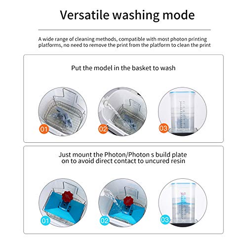 Dos modos de lavado: 1.Modo de lavado versátil: puede poner el modelo en una canasta de metal para lavarlo. 2.Lavado cerrado: simplemente monte la placa de construcción para evitar la exposición a la resina.