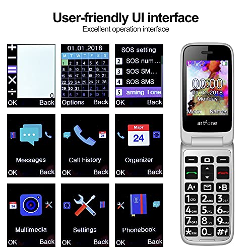 Este teléfono de concha es un teléfono fácil de usar con un diseño moderno, cabe en cualquier bolso o bolsillo de pantalón. Sus funciones principales son hacer llamadas y enviar y recibir SMS. Ideal para quienes les gusta simple y claro. Los botones grandes y la gran pantalla a color iluminada hacen que sea fácil de manejar, especialmente perfecto para personas mayores.