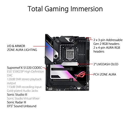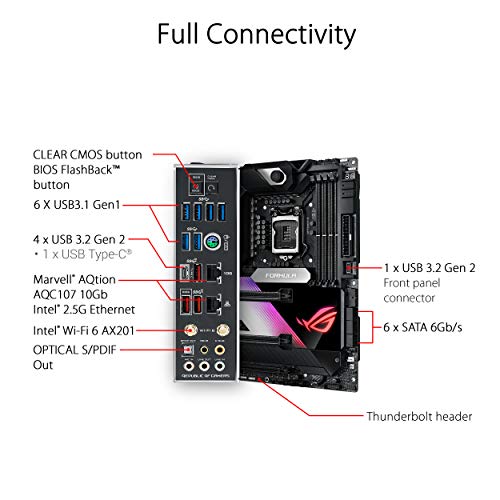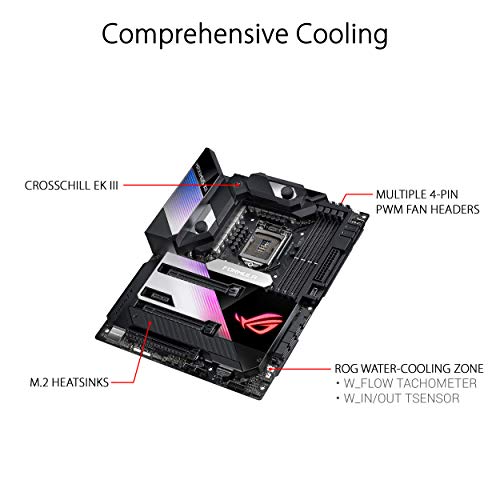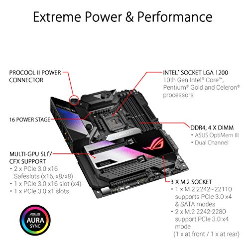 Socket LGA 1200 para la 10a gen de procesadores Intel Core. Mejoras de IA: Overclocking, refrigeración y redes asistidas por IA (Desde Game First VI). Potente diseño de alimentación: Suministro energético con 16 etapas de potencia, tomas de alimentación ProCool II, chokes de aleación MicroFine y condensadores 10K. Refrigeración mejorada: OptiMem III, CrossChill EK III con 16 etapas de potencia, caloducto en forma de U, almohadillas térmicas, zona de refrigeración líquida de ROG, disipador M.2 y placa trasera. Conectividad de próxima generación: Intel Wi-Fi 6, 10 GbE Ethernet e Intel 2.5 GB Ethernet y tres ranuras M.2.