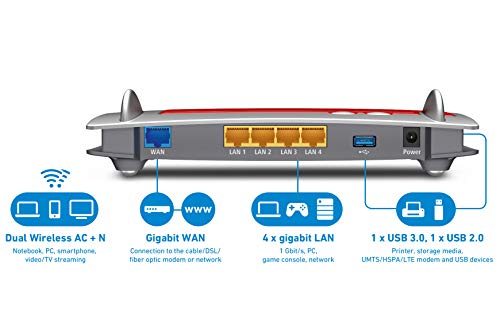 Puerto WAN Gigabit, 4 x LAN Gigabit para conectar ordenadores y videoconsolas, 2 x USB (3.0 / 2.0) para impresoras, dispositivos de almacenamiento en red o conectar un módem USB 3G/4G, FRITZ!NAS