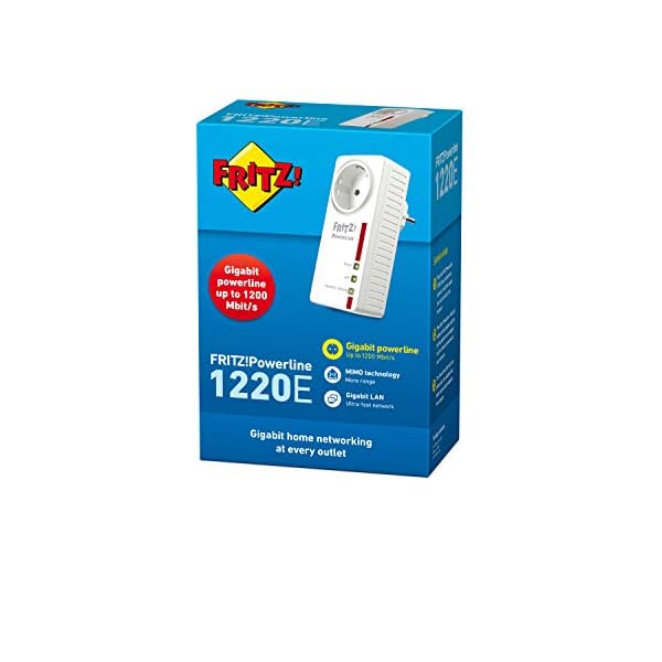 Contenido de la caja: 1 x adaptadores/extensores fritz. Powerline 1220e, 1 x cable de red de 1.80m, guía rápida de instalación en español