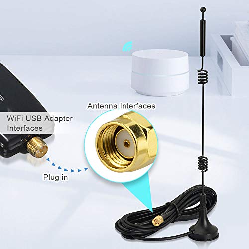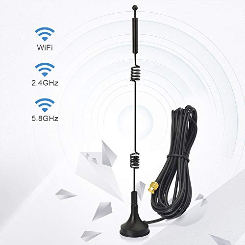 WiFi de Doble Banda: 2.4 GHz (2400 – 2485 MHz), 5 GHz / 5.8 GHz (5150 – 5850 MHz); Ganancia: 9dBi; Dirección: Omni-direccional; Conector de Antena: Conector Macho RP-SMA; Longitud del Cable: 3 Metros / 9.84 Pies; Paquete: 2 x Antena WiFi;