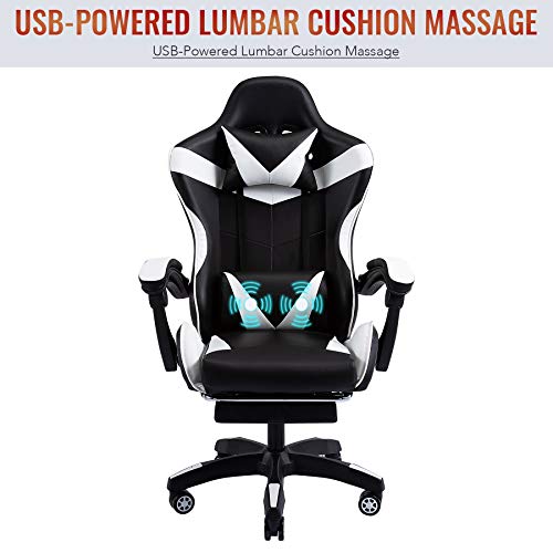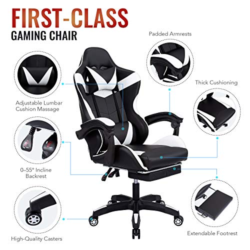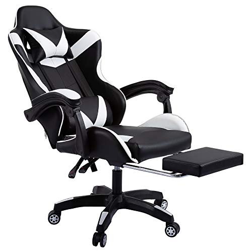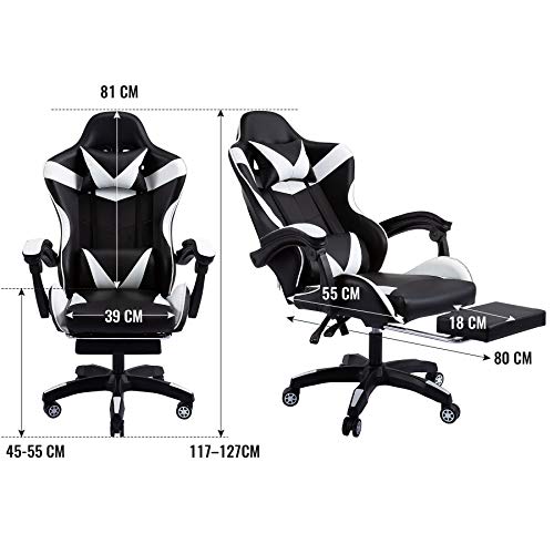 RELAJACIÓN DE CUERPO COMPLETO — Esta silla ergonómica para juegos, que brinda un apoyo completo de la cabeza a los pies, también incluye un reposapiés extensible y se reclina hasta 145 ° para pasar de una silla de oficina en casa a una cómoda cama con solo tirar de una palanca