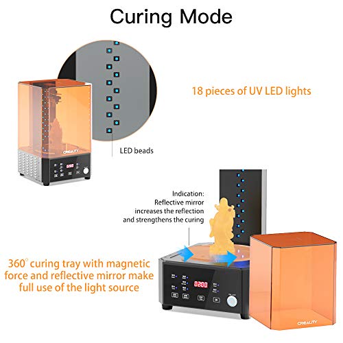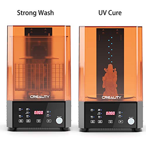 Dos en uno: la máquina de lavado y secado Creality UW-01 ayuda a lavar y endurecer modelos de impresión. La hélice electromagnética se mueve para remover el alcohol y lavar la resina no endurecida. Si los objetos impresos tienen una textura suave. El tratamiento de luz UV le da excelentes propiedades superficiales.