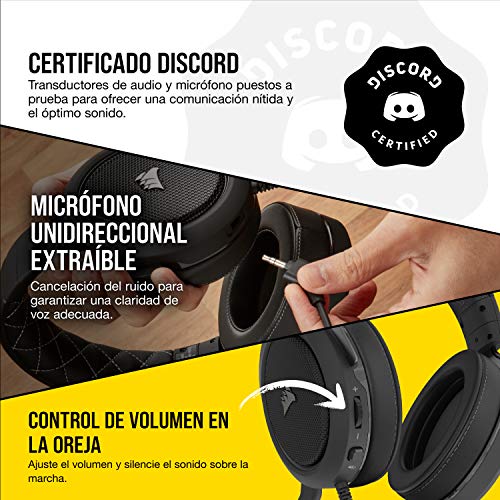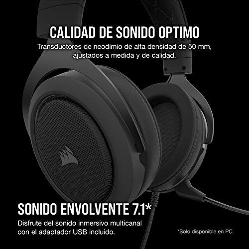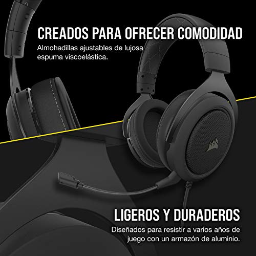 Los auriculares para juegos CORSAIR HS60 PRO SURROUND son cómodos y de calidad, con almohadillas de espuma con memoria y transductores de audio de neodimio de 50 mm de ajuste personalizado, diseñados para durar gracias a una construcción ligera y duradera.Un micrófono unidireccional extraíble y con cancelación del ruido ayuda a que la voz se oiga alta y clara. Un conector de audio chapado en oro de 3,5 mm garantiza la compatibilidad con PC, Xbox One, PS4, Switch y más. Disfrute de un sonido 7.1 inmersivo en PC con el adaptador USB incluido, alimentado por el software CORSAIR iCUE. Se completa con controles de volumen y silenciado en la oreja para ajustar el audio de forma cómoda. Los HS60 PRO se han diseñado para garantizar la comodidad y para que sean dignos de cualquier batalla.