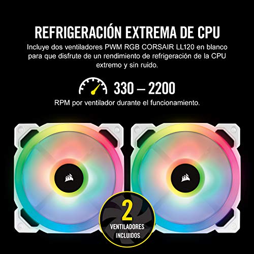 Ventiladores PWM RGB: Dos ventiladores PWM CORSAIR LL120 RGB ofrecen una explosión de color gracias a los 16 LED que hay en cada uno de ellos.
