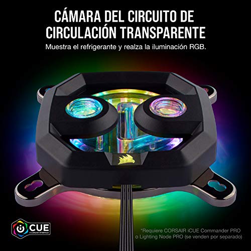 El bloque de refrigeración líquida para CPU Corsair Hydro X Series XC7 RGB combina un diseño de primera calidad, una iluminación RGB intensa y un rendimiento de enfriamiento extremo. La placa refrigerante de cobre niquelado y mecanizado y más de 60 aletas de microrrefrigeración de alta eficacia extraen el máximo posible de calor de la CPU, reduciendo las temperaturas para que pueda llegar al máximo de velocidad. La cámara de flujo transparente deja a la vista el refrigerante, iluminado por 16 LED RGB direccionables individualmente que ofrecen 360° de iluminación RGB personalizable, que se pueden controlar si se añade un Corsair Lighting Node PRO o Commander PRO. El XC7, con el software Corsair iCUE, ofrece una personalización y un control de la iluminación casi ilimitados, puede convertirse en la pieza central del sistema de refrigeración personalizado.