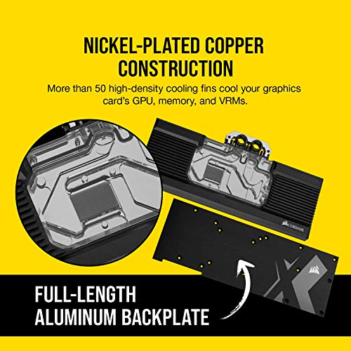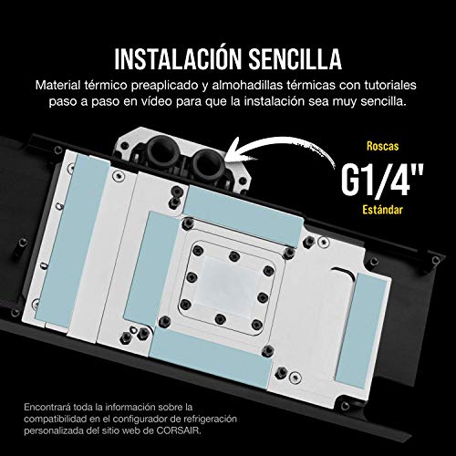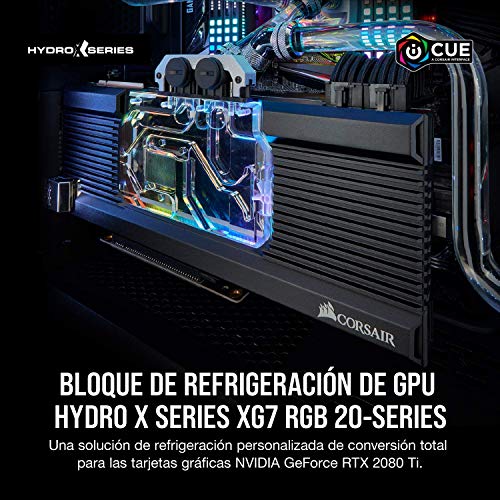 El bloque de refrigeración líquida para CPU Corsair Hydro X Series XG7 RTX 20-Series es un bloque de refrigeración líquida de cobre para las tarjetas gráficas NVIDIA GeForce RTX 2080 Ti. La estructura de cobre niquelado alisado mediante control numérico computarizado y más de 50 aletas de refrigeración de alta densidad colocadas sobre la GPU maximizan la transferencia térmica y el área de Superficie para reducir la temperatura drásticamente y aumentar el rendimiento. El circuito de circulación transparente y la discreta iluminación RGB muestran la tarjeta gráfica como nunca, sobre todo si se combinan con Corsair Lighting Node PRO o Commander PRO y el software Corsair iCUE. La carcasa de aluminio y la placa de soporte incluida rodean los componentes más importantes de la tarjeta gráfica para conseguir una refrigeración personalizada. Con el material térmico preaplicado, las roscas estándar G1/4″ y las sencillas instrucciones paso por paso, nunca ha sido tan fácil desatar todo el potencial de NVIDIA GeForce RTX 2080 Ti.