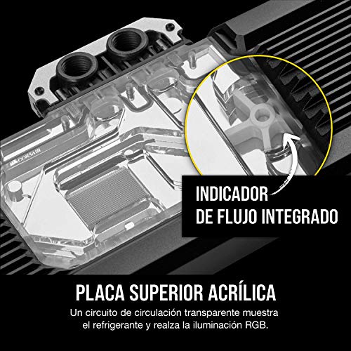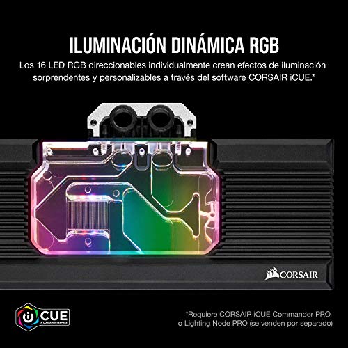 Iluminación RGB integrada: Los 16 LED RGB integrados en el bloque para GPU ofrecen una iluminación RGB personalizable y brillante si se combinan con CORSAIR Lighting Node PRO o Commander PRO