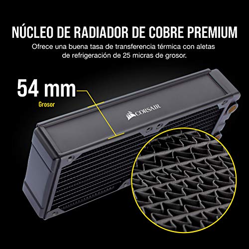 El radiador de refrigeración líquida Corsair Hydro X Series XR7 de 240 mm brinda un rendimiento de refrigeración líquida personalizada extremo, con un grosor de radiador de 30 mm y aletas de refrigeración de 25 micras de grosor que maximizan el área de Superficie de disipación del calor. El núcleo de cobre premium del radiador se ha optimizado para su uso con bloques de refrigeración líquida de cobre para CPU y GPU, aumentando mucho más la tasa de transferencia térmica. Se incluyen extras intuitivos, como guías integradas para los tornillos de los ventiladores y placas integradas de protección para los tornillos, que facilitan la instalación de los ventiladores sin que tenga que preocuparse por si daña el radiador. El radiador XR7 de 240 mm está equipado con roscas estándar G1/4″ para garantizar una compatibilidad universal, además de un área de Superficie que puede incluso con el hardware más vanguardista.