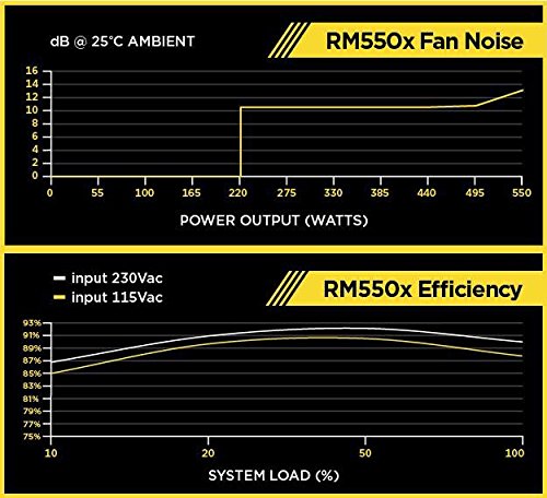Las fuentes de alimentación CORSAIR RM550x Series se fabrican con componentes de la máxima calidad para proporcionar una potencia eficiente de 80 PLUS Gold a su PC. Gracias al uso exclusivo de condensadores totalmente japoneses a 105 °C, los usuarios pueden fiarse de la larga vida útil y la fiabilidad de las PSU RM550x. El modo Zero RPM significa que las PSU RM550x Series son prácticamente silenciosas a media y baja carga, e incluso a máxima potencia, un ventilador que emite poco ruido garantiza un funcionamiento silencioso. Los cables totalmente modulares facilitan el ensamblaje y la actualización de los PC, ya que solo tiene que instalar los cables que necesita el sistema. Las PSU RM550x, silenciosas, eficientes y fiables, tienen todo lo que necesita para alimentar su PC de alto rendimiento.