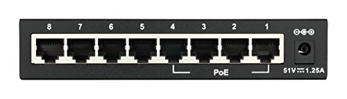 Dispone de 8 puertos 10/100 Mbps, todos traseros, donde los numerados del 1 al 4 son PoE 802.3af de hasta 15.4W, para un total de hasta 52 W