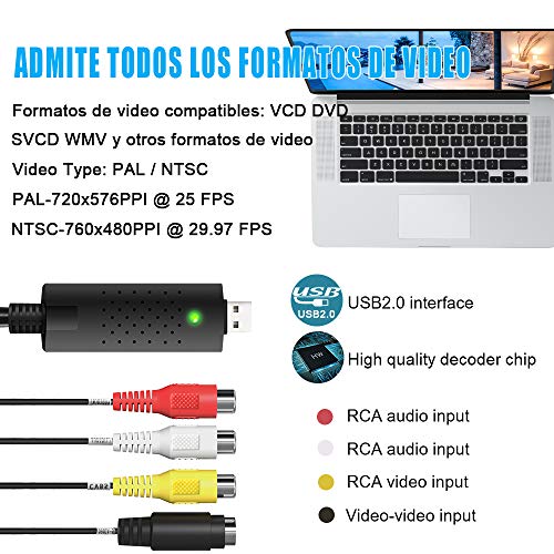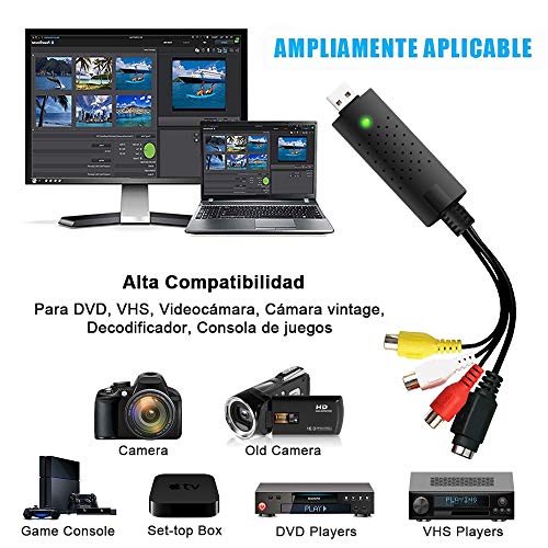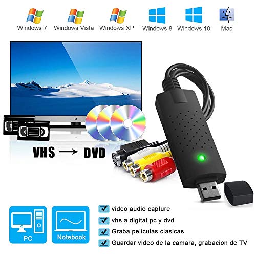 USB 2.0 Capturadora De Video Y Audio: DIWUER Convertidor de Audio / Video puede tocar a VHS VCR DVD y otros dispositivos a través de RCA o S-Video, para VHS digital y edición de video.