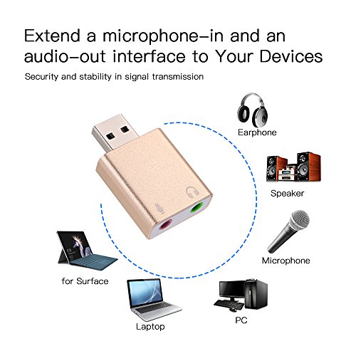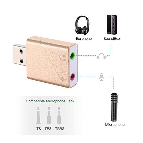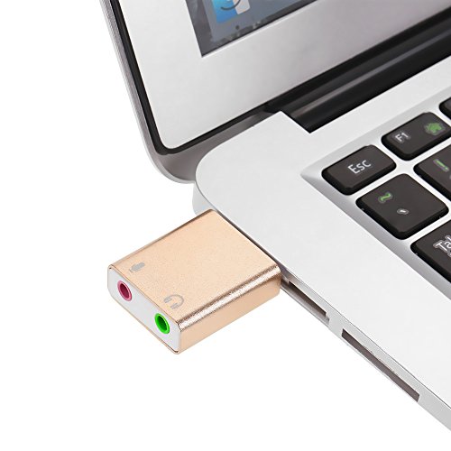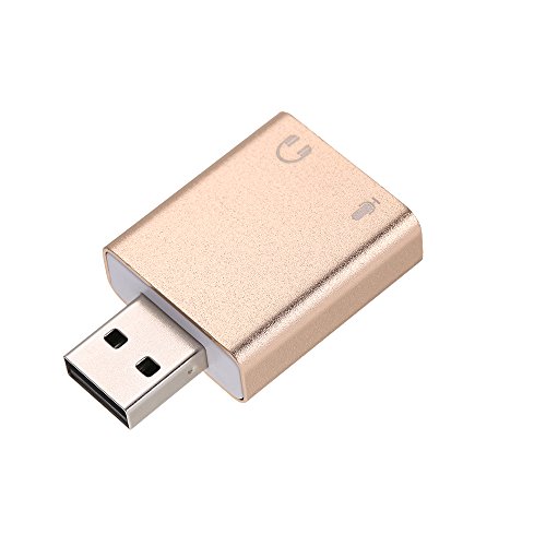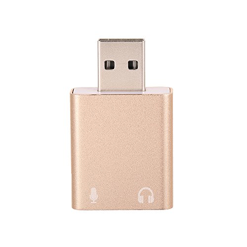 La tarjeta de audio USB externa usb-3d presenta una interfaz de audio altamente flexible que es universalmente compatible con todos los Sé Pop de PC y ordenadores portátiles, etc. en paquete con el software de simulación Xear 3d Sound, transforma tus auriculares o altavoces estéreo de audio de 7.1 canales en tu PC. Ningún driver externo y alimentación necesaria, basta con conectar y pasar a la reproducción de audio instantánea. Carcasa de aleación de aluminio lleno, el aspecto exterior es noble, amable y duradera sin óxido. Tamaño compacto, de cómodamente conectado a tu ordenador portátil. específica: Material: aleación de aluminio Color: Oro Conector para ordenador: USB 2.0 macho Conector de auriculares/altavoz (verde): 3,5 mm hembra Conector de micrófono (rosa): 3,5 mm hembra Sistema operativo: para Win 10/8/7/98SE/ME/2000/XP/servidor 2003/Vista/Linux/Mac OSX/PS4/Google Chromebook/Android Tamaño del artículo: 4,3 * 2,5 * 1 cm/1,7 X 1 X 0,4 pulgadas (L x W x H) Peso del artículo: Aprox. 10 G/0,4 onzas Lista de paquetes: 1 * Adaptador USB audio Sound corriente. Nota: La lista de los paquetes sin manual de usuario. Este adaptador funciona para PS4 pero no para PS3, para la interfaz USB de PS3 no transporta la señal de audio y soporta sólo para micrófono mono TRS, no para TS, TRRS, gracias.