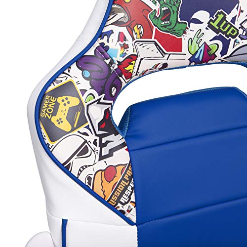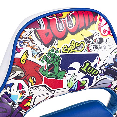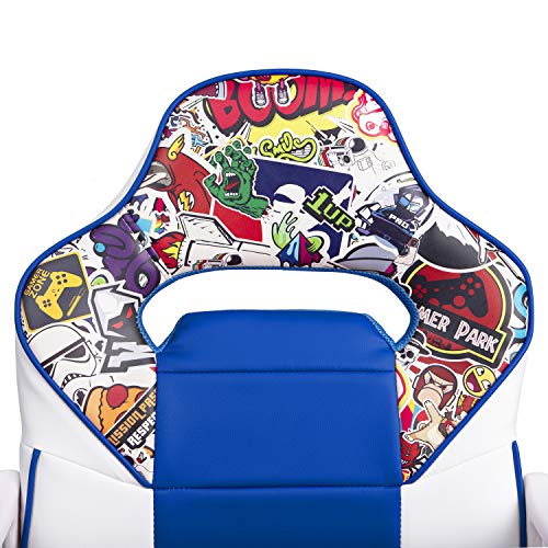El respaldo y el asiento presentan un gran acolchado que te aportará comodidad, están fabricados en símil piel de calidad color Blanco – Azul y Stickers para acentuar su aspecto gamer.