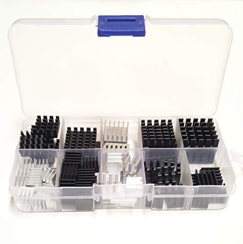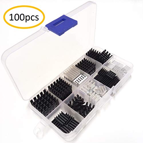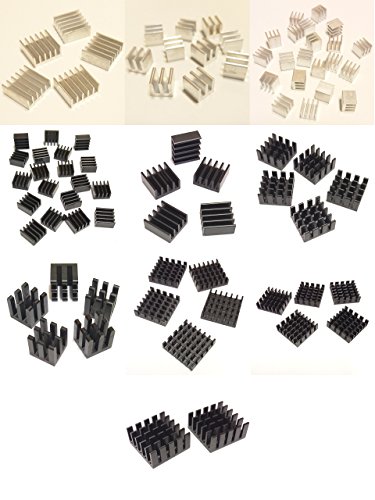 100 piezas unidades de disipador de calor de tamaño pequeño a mediano.Aluminio anodizado de tamaño pequeño: 20 unidades de 9 x 9 x 5 mm, 8 unidades de 10 x 10 x 10 mm, 8 unidades de 11 x 11 x 5 mm (largo x ancho x alto). Aluminio anodizado de tamaño mediano: 8 unidades de 14 x 14 x 7 mm, 8 unidades de 19 x 19 x 5 mm, 8 unidades de 20 x 20 x 6 mm (largo x ancho x alto). Aluminio anodizado de tamaño mediano: 2 unidades de 22 x 22 x 10 mm (largo x ancho x alto). Aluminio en tono plateado: 20 piezas de 7 x 7 x 6 mm, 10 unidades de 8,5 x 8,5 x 8 mm, 8 unidades de 15 x 15 x 6,5 mm (largo x ancho x alto).