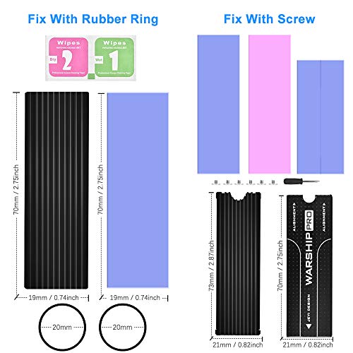 Ambos disipadores de calor SSD están disponibles para el SSD M.2 2280. Incluyendo un disipador de calor de fijación de tornillo, banda de goma que fija el disipador de calor, tornillos, anillo de goma y almohadilla térmica de silicona. Compatible con Samsung 850 EVO, 860 EVO, 960 EVO, 970 EVO, 950 PRO, 960 PRO, 970 PRO SSD, etc.