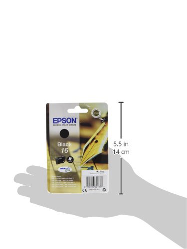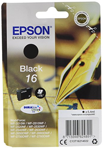 Singlepack de color negro – 16 DuraBrite Cartucho de tinta. Las tintas Epson DuraBrite Ultra Ink producen documentos de texto de calidad profesional y fotografías de calidad de laboratorio que no solo tienen un aspecto fantástico, sino que además son resistentes al agua, los borrones y la decoloración.