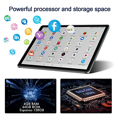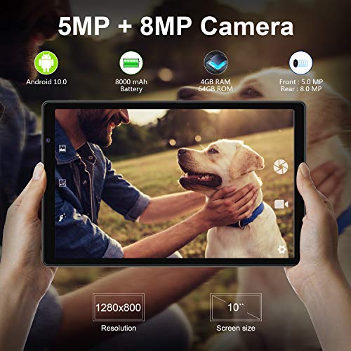 ★【ANDROID 10.0 ,4GB RAM 】10 Pulgadas Tablet Android 10.0 con 4GB de memoria incorporada y 64GB de memoria de almacenamiento – hasta 128GB (La tarjeta microSD se vende por separado), asegurando que su computadora funcione a alta velocidad. batería de 8000mAh, Compatibilidad con cámaras de 5,0MP+8,0 MP, tablet con doble altavoz estéreo, incorporado WIFI | Bluetooth 4.0.No es compatible con tarjeta SIM.