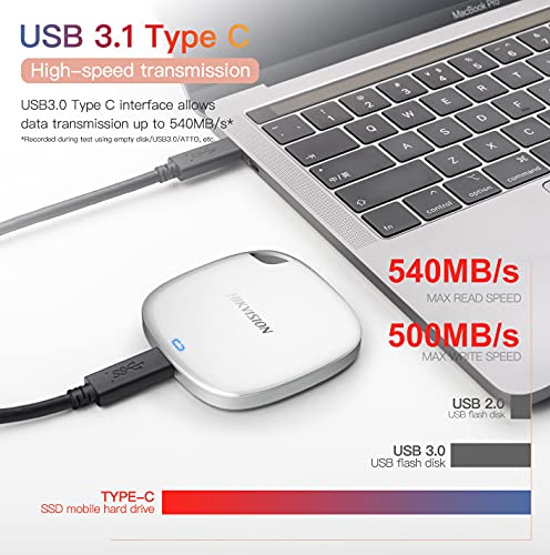 Transferencias de alta velocidad: las velocidades de lectura de hasta 540 MB / s le permiten mover fotos y videos de alta resolución rápidamente, transfiere archivos casi 5 veces más rápido que la unidad de disco duro externa (HDD), según las pruebas internas, el rendimiento puede variar según el dispositivo host, condiciones de uso, capacidad de la unidad y otros factores.