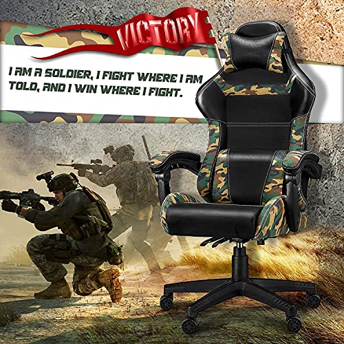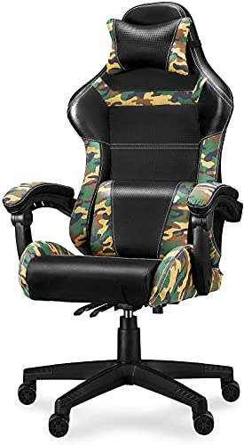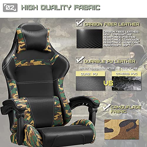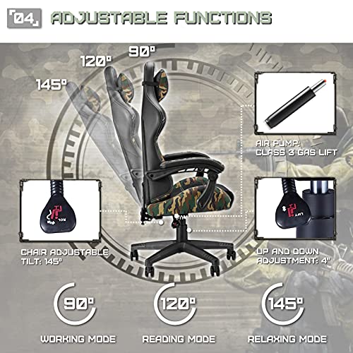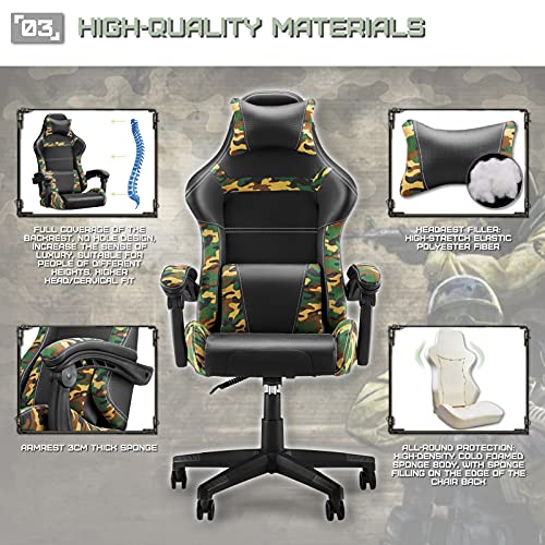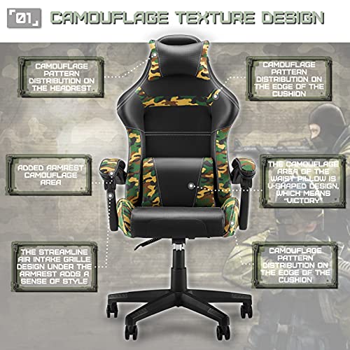 🦖【Silla para juegos de camuflaje Huracan】 El patrón de camuflaje aparece en el reposacabezas, el respaldo de la silla, el soporte lumbar, el cojín del asiento y los apoyabrazos. El camuflaje conecta el soporte lumbar y el respaldo de la silla en una “V”, simbolizando la victoria en cada batalla. Un diseño de rejilla sencillo agregado a los reposabrazos, lo que lo hace más involucrado con el personaje del juego. Adecuado para jugadores o YouTubers cuando juegan o transmiten un juego en vivo.
