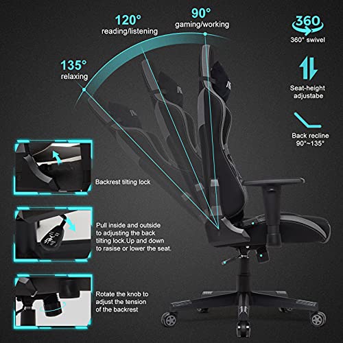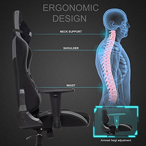 AJUSTABLE: Con un rango de altura ajustable de 7.5 cm para adaptarse a todas las alturas y diferentes escritorios, puede establecer la altura más cómoda que le guste , con una función de giro de 360 grados, e incluye el cojin lumbar, reposacabazas y el apoyabrazos ajustables. Los apoyabrazos de cuero de PU apoyan el ajuste de elevación 2D, y la experiencia cómoda le permite despedirse del dolor de codo. Haga su vida más fácil y cómoda.
