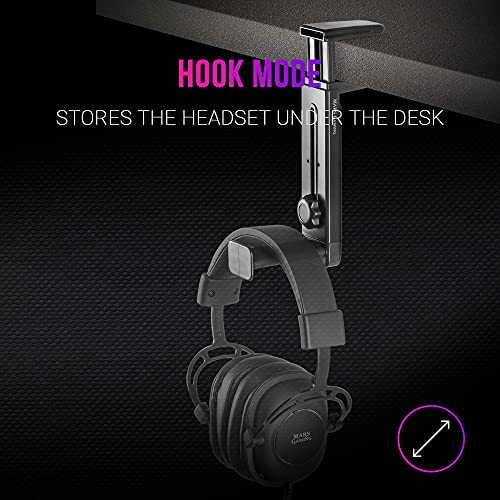 El MHH2 es el soporte de cascos definitivo 2 en 1: instálalo bajo o sobre la mesa sin ocupar apenas espacio. con una sencilla sujeción tipo pinza para fijar a la mesa, un tamaño ajustable y un mecanismo de 360° para una gran accesibilidad, podrás acceder a tus auriculares rápidamente tanto debajo/sobre como dentro/fuera de la mesa para una optimización máxima del espacio y con el cable recogido en todo momento.