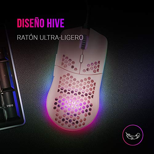 Ratón gaming diseño hive ultraligero de 69g con carcasa aerodinámica que minimiza la resistencia; acabado en rosa