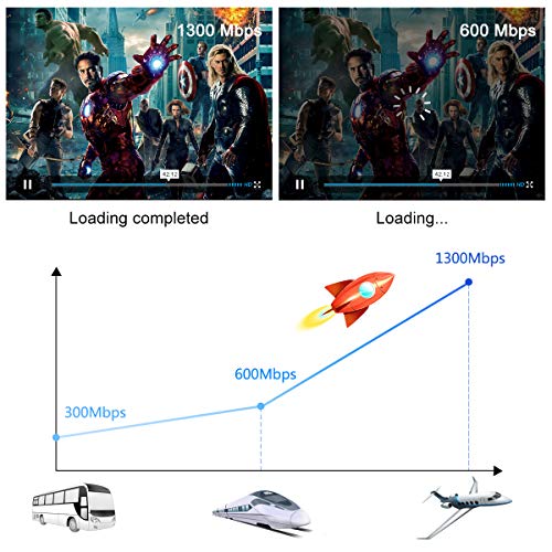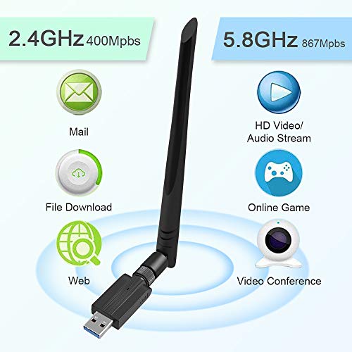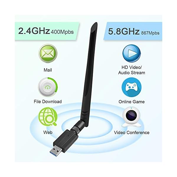 【Velocidad Inalámbrica Increíble】Esto USB Wifi adaptador tiene bandas de 5GHz (867Mbps) o 2.4GHz (400Mbps). Con la última tecnología 802.11ac y las bandas duales seleccionables, hasta 1300M. Esta antena wifi usb minimiza la interferencia y es ideal para ver videos HD de alta definición, transmisión de audio y juegos en línea.