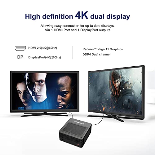 【Salida de pantalla dual HD】 Equipado con una tarjeta gráfica Radeon Vega 11 (frecuencia de gráficos 1300 MHz), se pueden conectar dos pantallas a través de una conexión HDMI y DisplayPort y puede disfrutar del video 4K. Esto puede reducir el tiempo de búfer. Se utiliza para realizar múltiples tareas y mejora eficazmente la eficiencia del trabajo. También es compatible con RTC Wakeup / Wakeup en LAN / Auto Power On.