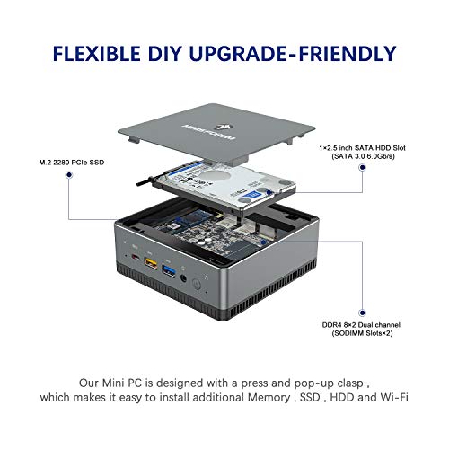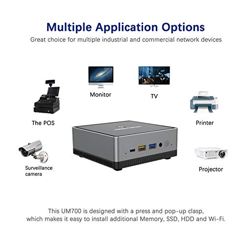 【Gran capacidad】 La PC de escritorio UM700 equipada con SSD Pcle M.2 2280 de 512 GB y RAM DDR4 de 8 GB × 2 de dos canales (ranuras SODIMM × 2). Además, el almacenamiento se puede ampliar a través de un disco duro SATA de 2,5 pulgadas (SATA 3.0 6.0Gb / s). Transferencia de archivos o reproducción de video, ¡es rápido de resolver!