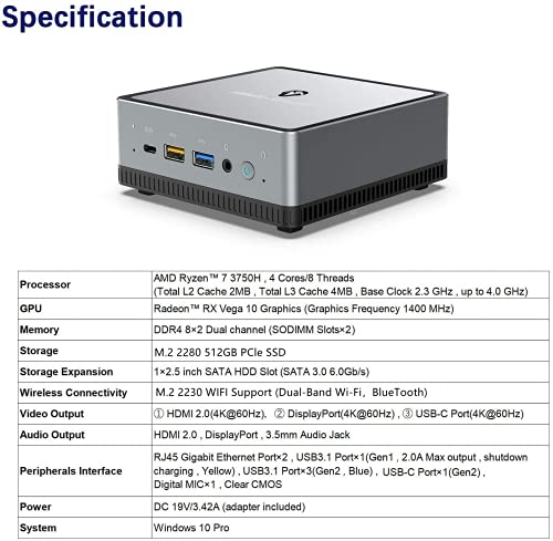 【AMD Ryzen 7 3750H】 El sistema Windows 10 Pro preinstalado en mini PC y equipado con un procesador AMD Ryzen 7 3750H (hasta 4.0 GHz). Gráficos Radeon RX Vega 10 (frecuencia de gráficos 1400 MHz). Una nueva generación de procesadores de alto rendimiento le brinda un funcionamiento más rápido y una experiencia más fluida.