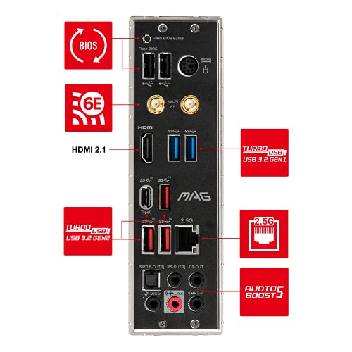 WI-FI 6E – Cuenta con la tecnología Wi-Fi 6E AX210 (latencia ultrabaja y gran ancho de banda) y Bluetooth 5.2; los puertos fijos incluyen USB 3.2 Gen 2 (10Gb/s), pantalla HDMI 2.1 a 4K/60Hz, LAN Intel 2.5G y audio 7.1 HD con Audio Boost 5