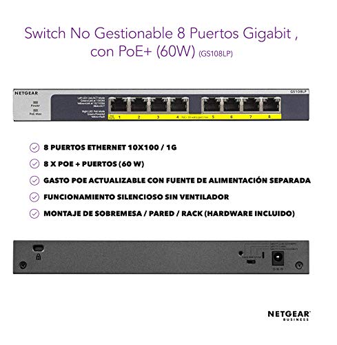 Power-over-ethernet: 8 puertos poe + con un consumo total poe de 60w, e incluye netgear flexpoe que lo hace expandible a 760w (con el módulo de fuente de alimentación comprado por separado)