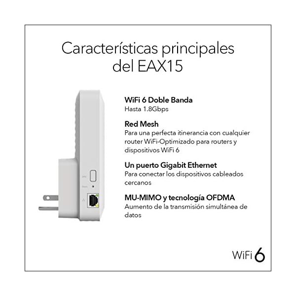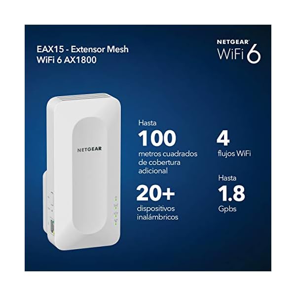 NETGEAR Repetidor WiFi 6 Mesh EAX15, Amplificador señal wireless AX1800, cobertura de hasta 100 m2 y 20 dispositivos