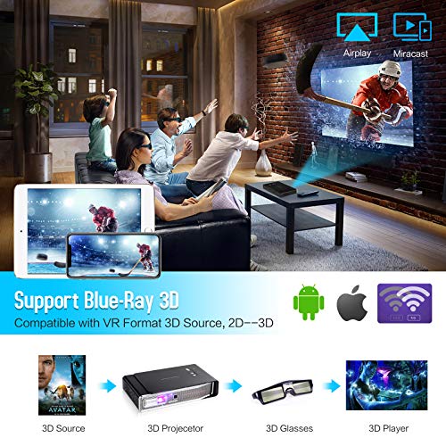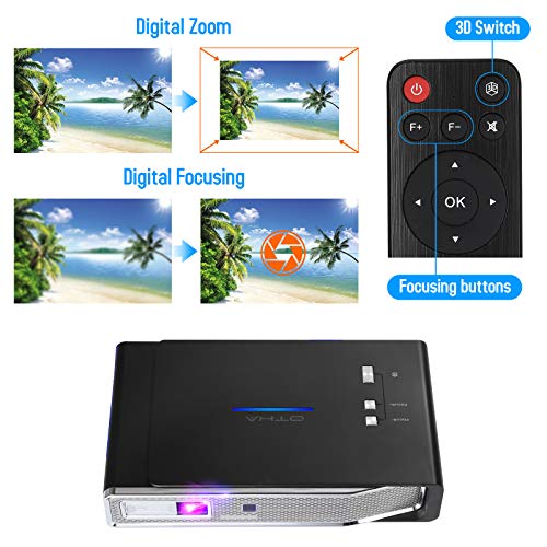 【Projector Mini proyector portátil 3D DLP】 Tamaño: 19 cm * 12,4 cm * 4 cm, peso 0,63 kg, el Proyector de bolsillo DLP Otha ha adoptado la tecnología más avanzada: tecnología de pantalla de consumo DLP 3D, función Soporte 3D (DLP-LINK), HD ray, compatible con fuente de VR 3D, procesador DualQuad-Core, sistema de ventilación y enfriamiento actualizado, sistema de enfoque de motor eléctrico, puede disfrutar de 3D-2, excelente experiencia de visualización diurna