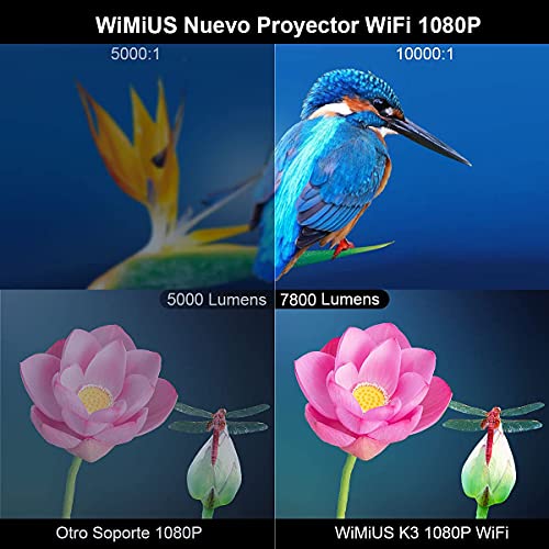 💖【WiMiUS Último 7800 Lúmenes Proyector WiFi Full HD 1080P Soporte 4K】 Gracias a un alto brillo de hasta 7800 Lúmenes, una resolución nativa de 1920X1080P, una relación de contraste de 10000: 1 y una relación de aspecto de 16: 9/4: 3, y tecnología de mejora de píxeles, mejora del color y optimización del color de la piel, este proyector WiFi Full HD 1080p puede crear unos negros más profundo y unos blancos más brillantes, por lo que su proyección se vuelve más víva y emocionante.