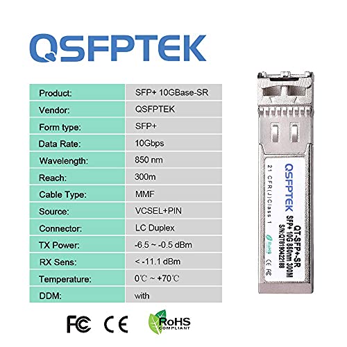 Módulo 10GBASE-SR SFP+: velocidad de datos de 10 Gb / s, conector LC dúplex multimodo, longitud de onda de 850 nm, distancia de transmisión de hasta 300 m, soporte DDM, temperatura de trabajo: 0 ℃ ~ +70℃. Potencia de transmisión (dBm): -6.5 ~ -0.5, Sens. Rx (dBm): < -11.1.
