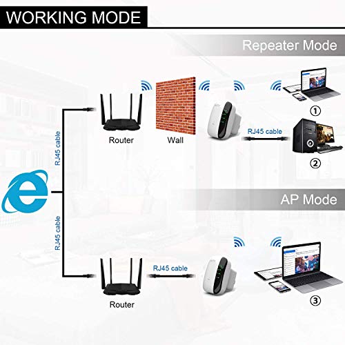 📶 【2 Modo de Trabajo】 – Admite modo repetidor y AP. El modo AP (punto de acceso) puede cubrir una red cableada a una red inalámbrica. El modo repetidor amplía la cobertura de las redes WiFi existentes.