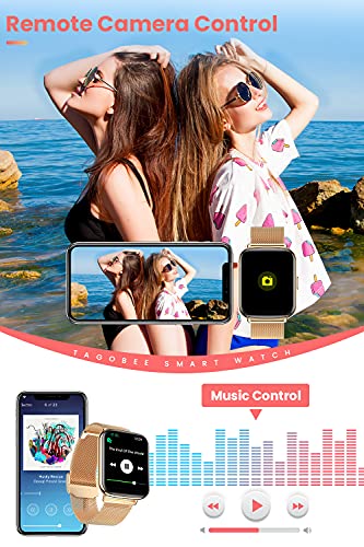 🎁【Funciones Múltiples】Smart watch no solo tiene el diseño elegente, sino que también dispone de muchas funciones. Se puede monitorizar en tiempo real la frecuencia cardíaca y el oxígeno en la sangre, monitor de sueño. Además, incluye el monitor de deporte, recordatorio de mensajes, recordatorio sedentario, cronómetro, controla la música, pronóstico del tiempo, fotografías remotas, alarma,atenuación,temporizador, linterna. Este smartwatch mujer sobrepasa sus expectativas.