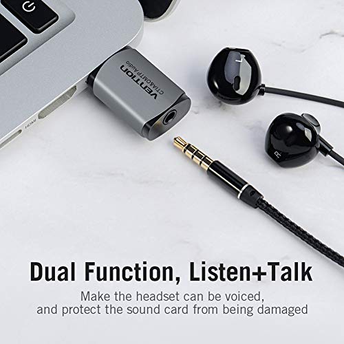Esta tarjeta de sonido externa USB tiene un puerto TRRS auxiliar de 3,5 mm (interfaz integrada de entrada de audio y salida de audio), que le permite conectar sus auriculares existentes con TRRS de 3,5 mm a su PC a través de una interfaz USB. Nota: El auricular debe soportar el micrófono si queremos una llamada de voz.