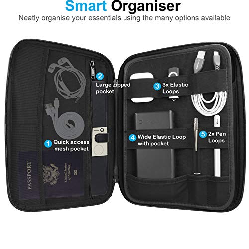 Capacidad organizada: 6 correas elásticas para organizar cables USB, auriculares, Apple Pencil y otros accesorios pequeños. Ranura para tarjetas de crédito, tarjetas bancarias u otras identidades. Una gran ranura de malla para un acceso rápido a varios dispositivos o cuadernos A5, etc., y un compartimento con cremallera para otros artículos esenciales.