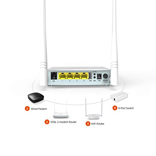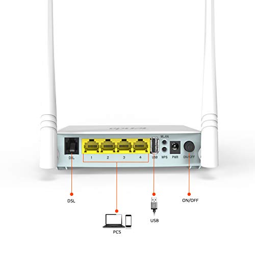 Tenda D301 Router Modem N300 inalámbrico WiFi (300 Mbps, 2 Antenas 5 dBi, a 2,4 GHz, USB 2.0, 4 Puertos WAN/LAN 10/100 Mbps, MIMO, WPS, IPTV)