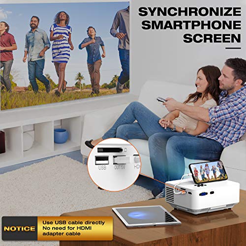 【Conexión USB Conveniente & Pantalla de Sincronización de Teléfono Inteligente】 -Conecta tus dispositivos y proyector con solo un CABLE USB para sistema Android o iOS, eliminando el adaptador tradicional Lightning-a-HDMI / MHL-a-HDMI para la conexión. Esto te ahorrará un mucho dinero para comprar un adaptador HDMI tradicional. También resuelve el problema de la conexión inestable usando WIFI y las restricciones en la ubicación de uso y la pérdida fácil de la señal.
