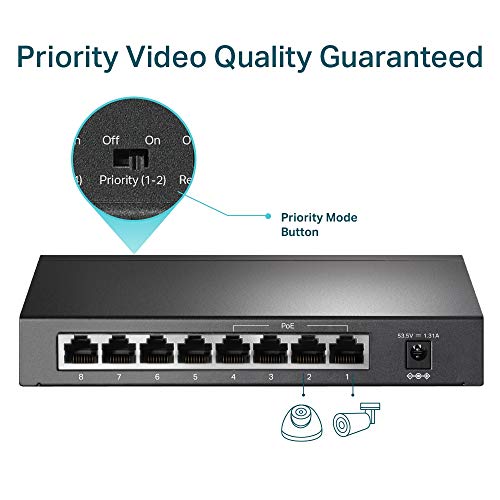 El TL-SF1008P tiene la función de prioridad la cual ayudará a proteger el sistema cuando se sobrecargue la alimentación del sistema. Si todo el consumo de energía PDs PoE es> = 57W, se organizará una prioridad entre los puertos PoE, el sistema cortará la alimentación del puerto de menor prioridad.