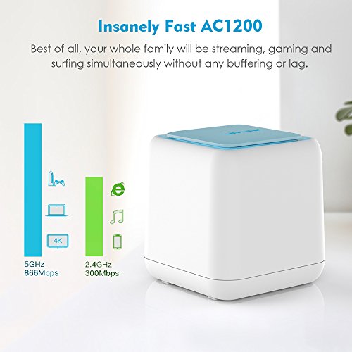 Elimina las zonas muertas de WiFi y el almacenamiento en búfer: el estándar Wi-Fi 802.11ac ofrece velocidades de datos de hasta 1200Mbps (2.4GHz 300Mbps + 5GHz 900Mbps). La tecnología Beamforming mejora la cobertura de Wi-Fi, cada punto cubre 1,000 pies cuadrados, por lo que 2 puntos pueden cubrir 2,000 pies cuadrados, agregue 1 punto de satélite más para obtener más cobertura de 1,000 pies cuadrados. Se pueden agregar hasta 9 puntos de satélite