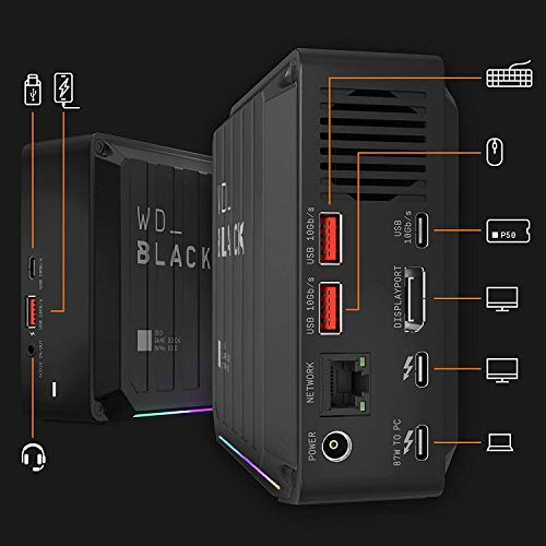 Transforma fácilmente tu ordenador portátil en una base para juegos totalmente integrada con la estación de juegos WD_BLACK D50 NVMe SSD, que te ayudará a despejar el desorden gracias a un único cable Thunderbolt 3 que se conecta sin problemas a varios periféricos y una pantalla adicional de hasta 5 K 60 Hz para crear la mejor estación de juegos optimizada. Empieza a jugar antes gracias a la tecnología NVMe, que alcanza hasta 3000 MB/s de velocidad de lectura y hasta 2500 MB/s de velocidad de escritura. Guarda más juegos y datos gracias a los 2 TB de capacidad. Su diseño compacto y elegante se completa con la iluminación RGB totalmente ajustable para personalizar tu estación (solo para Windows).